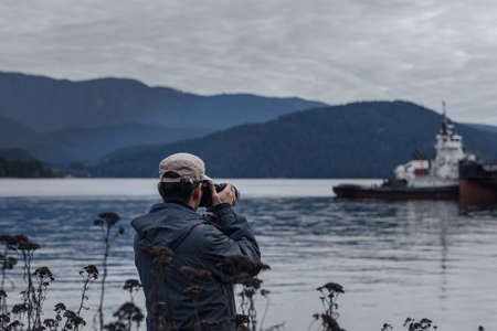 A man with a camera on the background of a ship and mountains.