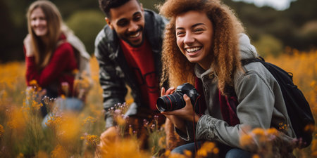photo group of teenage as a backpacker in the dark wood, generative AI