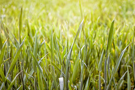 Close up young green wheat seedlings growing in a soil on a field in a sunset. Close up on sprouting rye agriculture on a field in sunset. Sprouts of rye. Wheat grows in chernozem planted in autumn.