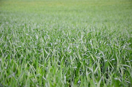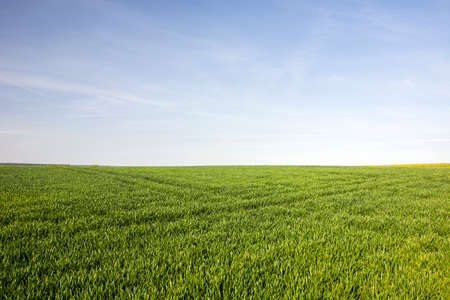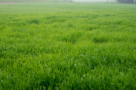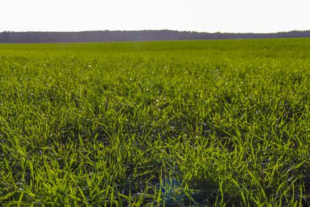 Young wheat plants growing on the soil, Amazingly beautiful endless fields of green wheat grass go far to the horizon.