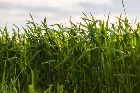 Juicy green grass rye wheat on the field close-up - agricultural technology, growing plants, harvesting. Farm rural landscape