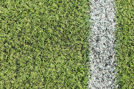 Playfield border. Closeup view to white lines on football playground. Detail of a of white lines in a soccer field.