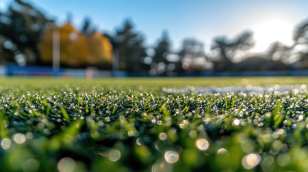 A detailed close-up of an artificial grass field glistening with dew under soft morning light, perfect for showcasing sports activities or outdoor recreational themes.
