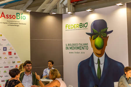 BOLOGNA (ITALY), SEPTEMBER 10, 2018: Visitors are visiting a stand and asking exhibitor about the products at SANA, international exhibition of organic and natural products