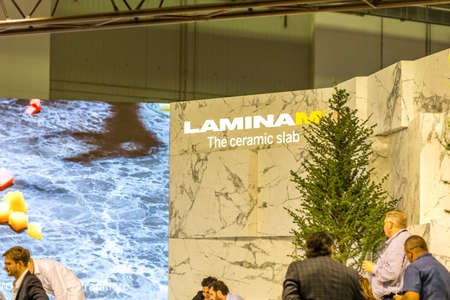 BOLOGNA (ITALY), SEPTEMBER 26, 2018: light is enlightening LAMINAM logo at CERSAIE, international exhibition of ceramic tile and bathroom furnishings