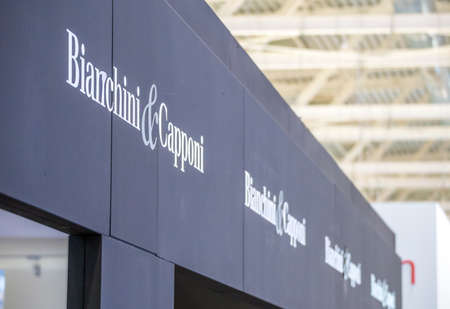 BOLOGNA (ITALY), SEPTEMBER 28, 2018: light is enlightening bianchini & capponi logo at CERSAIE, international exhibition of ceramic tile and bathroom furnishings