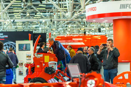 BOLOGNA, ITALY – NOVEMBER 10, 2018: people visiting the fair and shooting photos with mobile phone at EIMA 2018, International Agricultural and Gardening Machinery Exhibition