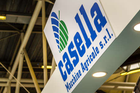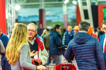 BOLOGNA, ITALY – NOVEMBER 10, 2018: Booth presenter welcoming business visitors at EIMA 2018, International Agricultural and Gardening Machinery Exhibition