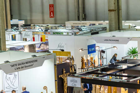BOLOGNA, ITALY - FEBRUARY 18, 2019: Booth presenter talking with visitors at stand LAL in DEVOTIO Religious products and service exhibition