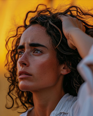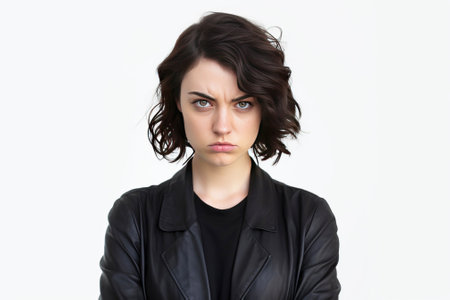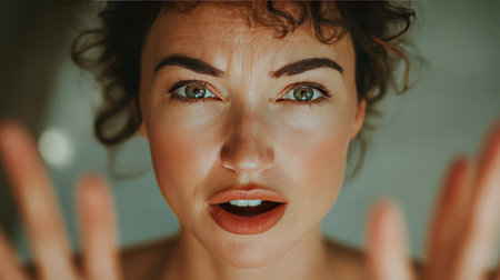 Young Adult with Curly Hair Showing Expression of Anger and Frustration Against Plain Background in Portrait Mode