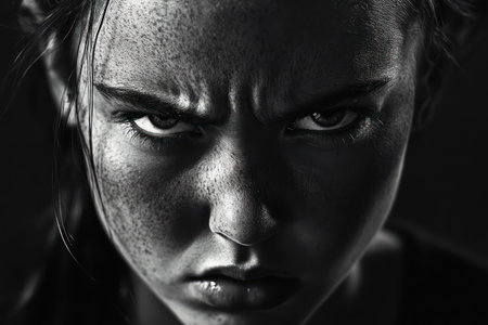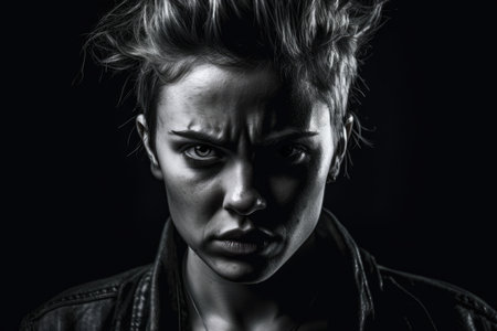 Angry female portrait captured in a high-contrast, black and white studio setting with dramatic lighting and intense shadows