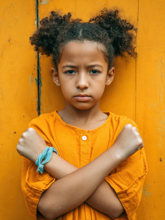 A young child stands confidently with arms crossed, showing strength and resilience against bullying in front of a vibrant yellow background.