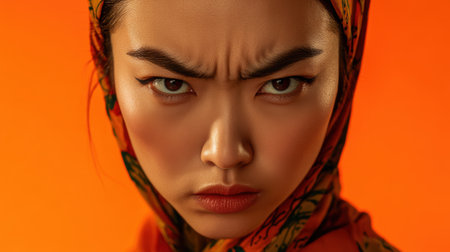 Close-up of a serious woman wearing a hijab with a furrowed brow and intense gaze, expressing determination or focus against a bright orange background.