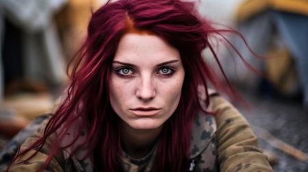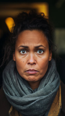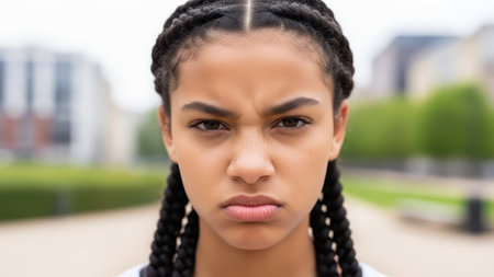 cropped portrait of a woman looking angry while sitting outside, created with generative ai