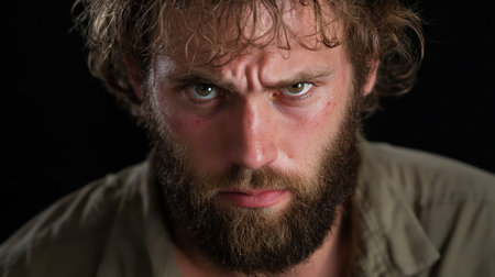 Close-up of young man with tense jaw and furrowed brows, showing deep frustration under studio lights, isolated brightly.
