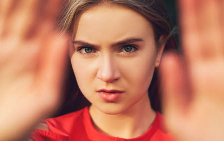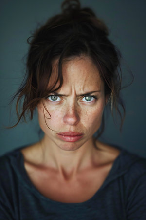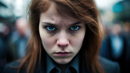 Portrait of a Young Woman with Intense Blue Eyes, Experiencing Anger, Shallow Depth of Field