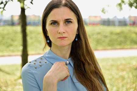 A photo of a caucasian brunette girl with long hair thinking in a park. Model posing against a background of trees in sunny weather showing discontent