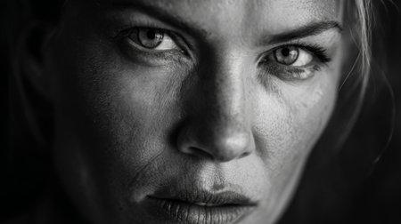 This powerful black and white portrait features a woman with striking eyes and an intense expression, capturing raw emotion and beauty in a close-up shot.