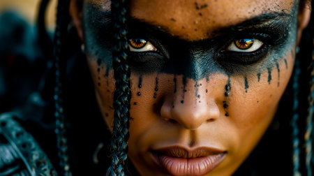 A close-up of a woman with dark skin wearing black makeup and black braids looking directly at the camera with a serious expression