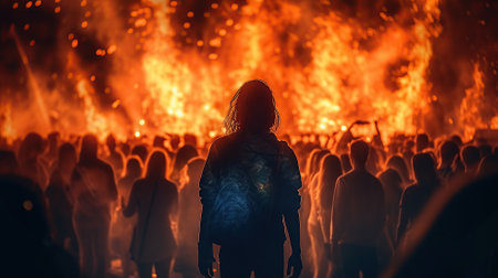 Group of people raising hands cheering and celebrating in front of huge bonfire flames at night, fire, warm colors, dark silhouettes, smoke, orange