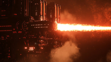 A rocket lifts off from a launch pad, releasing intense flames and thick smoke. The sky darkens as the vehicle ascends, marking a moment of thrilling excitement and technological achievement.