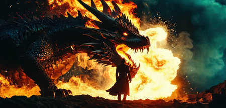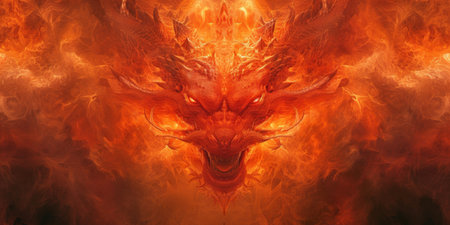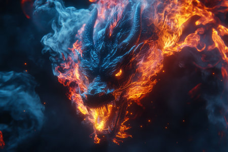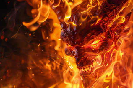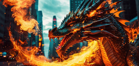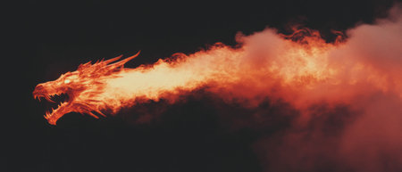 A dragon is breathing fire, with its mouth open and flames shooting out of its mouth. Concept of danger and power, as the dragon is a symbol of strength and ferocity
