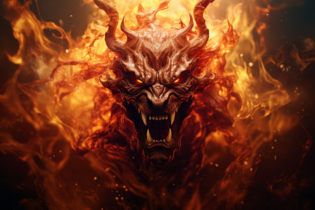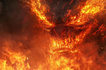 The fiery face created by the tongues of fire resembles the tales of legends and beliefs in the underworld and devils, red crimson orange colors and black smoke soot