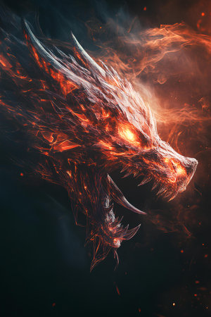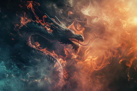 Digital art illustration of a fierce dragon surrounded by flames and mystical smoke