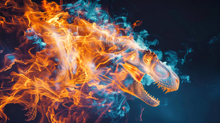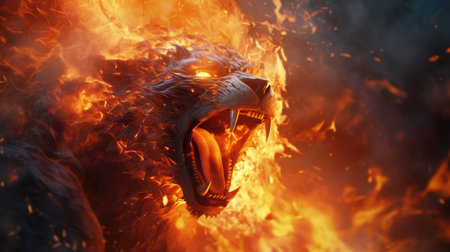 A fierce lion breathing fire, showcasing power and intensity in dramatic scene. vibrant flames contrast with lion majestic mane, creating captivating visual
