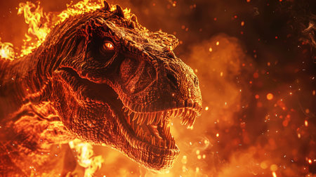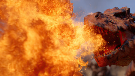 Close-up of a dinosaur exhaling flames ferociously, showcasing its fire-breathing abilities.