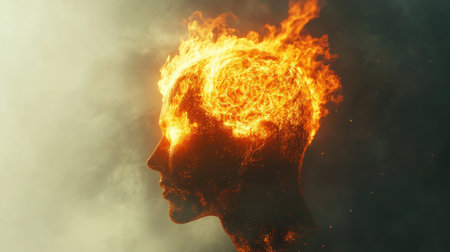 A man in a business suit with his head exploding into flames, symbolizing stress or burnout, set against a smoky background.