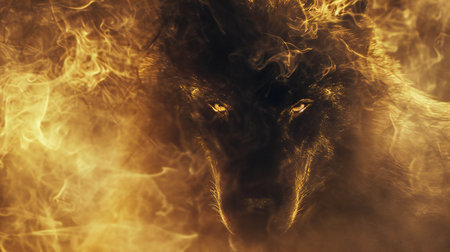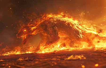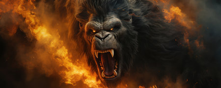 A majestic lion breathes fire against dramatic, fiery background, showcasing its power and intensity. scene captures wild spirit of this magnificent creature