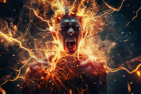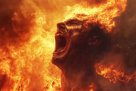 Screaming man engulfed in flames. Male face shouting in agony surrounded by fire. Suffering person
