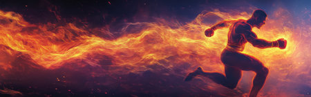 A striking silhouette of a boxer is filled with bright flames, showing powerful punches that leave trails of light. This enchanting scene captures the energy and dynamism of the sport.