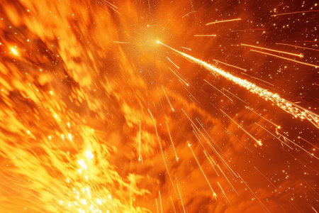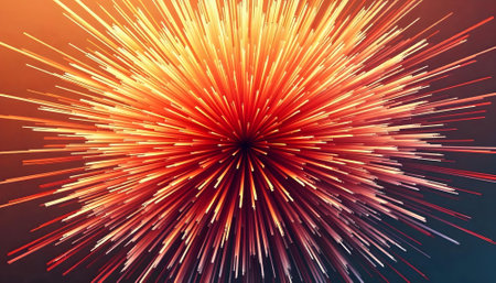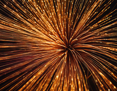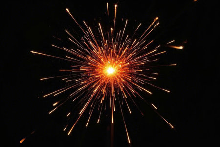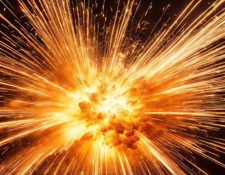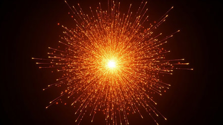 This image captures a stunning burst of light against a dark background. The explosion radiates outward in a symmetrical pattern, creating a mesmerizing display of fiery orange and yellow hues. The intense brightness at the center gradually fades into smaller, glowing tendrils, creating a sense of depth and dynamism. The contrast between the dark backdrop and the vivid explosion makes the image particularly striking and dramatic.