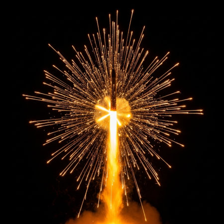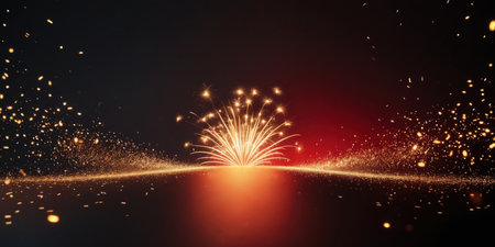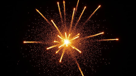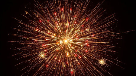 Shimmering fireworks explosion showing red, gold, and blue sparks isolated on black background, perfect for holiday celebration theme