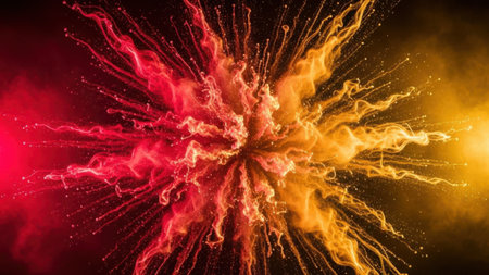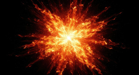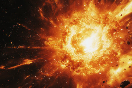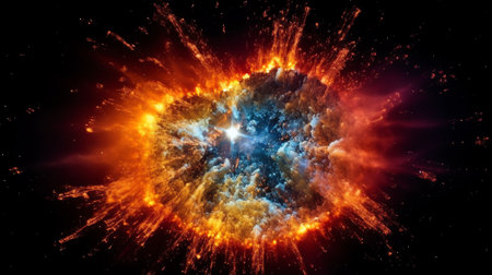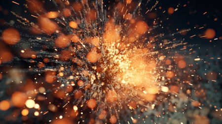dynamic burst of orange particles erupts from the center, scattering outward in a spectacular display of radiant energy, illuminating the surrounding darkness.