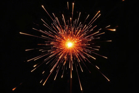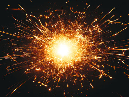 A dramatic image showcasing bright orange sparks erupting from a metal object on a dark surface, capturing the intense energy and dynamic motion of the fire and explosive reaction.