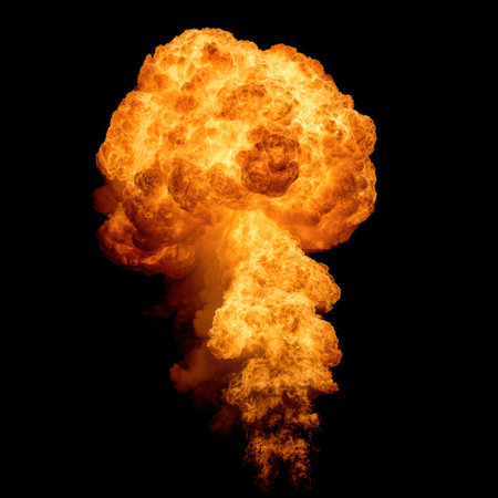 A powerful explosion erupts, creating a stunning display of fireballs and dark smoke against a dramatic sky, evoking feelings of awe and danger.