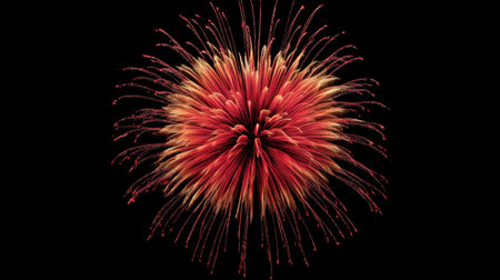 Vivid red and gold firework bloom with radiant, thin streaks elegantly against clean black.