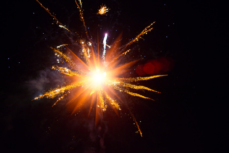 A huge explosion of fireworks in the night sky. Fire and smoke in the dark.
