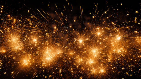 Exploding golden fireworks burst across the dark night sky, creating a spectacular display of light and celebration.