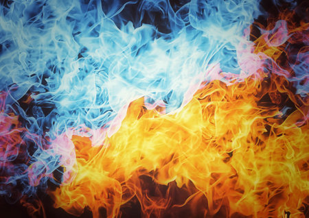 Fiery orange and cool blue smoke collide, creating a stunning abstract formation of contrasting elements.