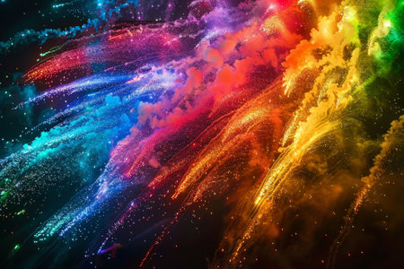 A burst of colorful paint particles disperses in all directions against a dark background, forming a stunning display of vibrant hues and dynamic patterns.