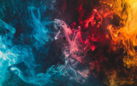 A close-up of colorful smoke flowing and twisting in the air, with bold, contrasting colors creating a vibrant and eye-catching effect.