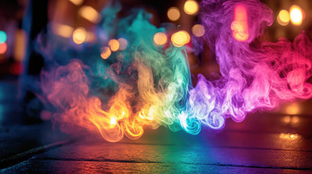 Vibrant and colorful smoke swirls create an enchanting atmosphere in this urban night scene, perfect for artistic and creative projects.