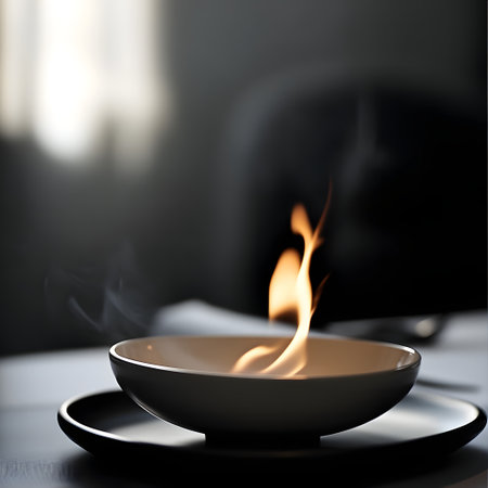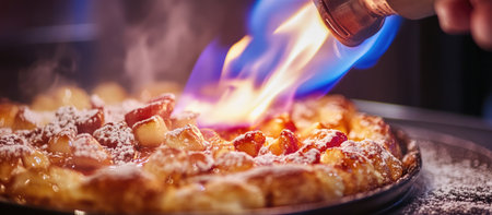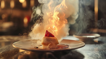 Professional chef using a spoon to flambe a dessert, creating a burst of flames tableside in a fine dining restaurant