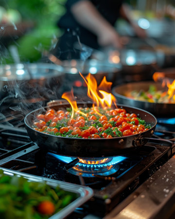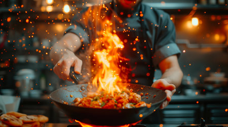 A chef expertly maneuvers a skillet, tossing ingredients as flames rise dramatically, showcasing the intense atmosphere of a bustling kitchen during dinner preparation.