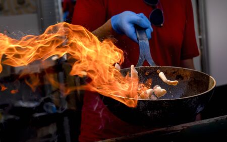 Flambe. Fire in frying pan. Professional chef in a commercial kitchen cooking. Man frying food in flaming pan on hob in outdoor kitchen