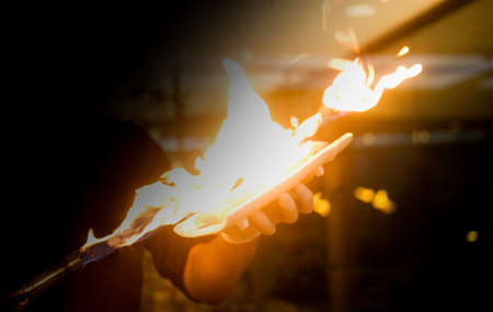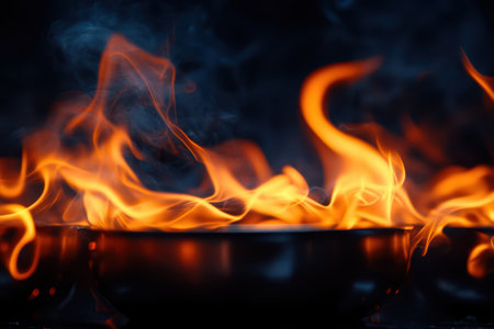 Flames flicker from a pot on a stove, illuminating the dark surroundings with a warm glow and creating an atmosphere of cooking and heat.